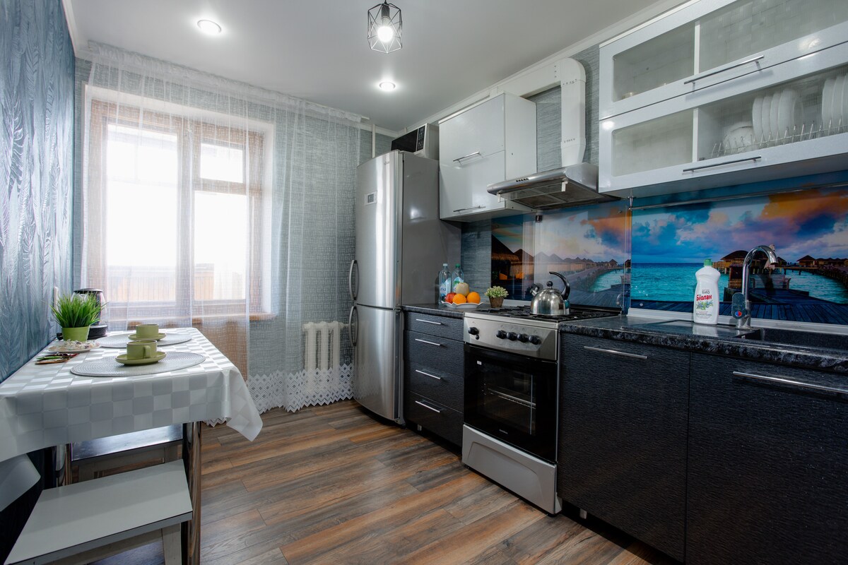Cozy apartment with everything you need for a comfortable stay. Towels, hygiene items. Nearby: Kostanay Plaza shopping center, railway station, Allur plant. The center is 10 minutes away by car. We are available 24/7, write/call the number.