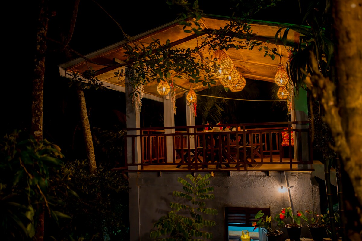 Perched in the midst of the family tea farm and surrounded by lush, landscaped gardens. This cabin has two large double beds one on a mezzanine, a dining area and tea and coffee making. A stones throw from a beautiful river, where you can wild swim. Perfect for exploring Sinharaja rainforest, host organises tours, with tuktuk pick ups and packed lunch wrapped in banana leaves. A wonderful breakfast is included and dinner at an additional fee. All meals are prepared lovingly by the hosts mother