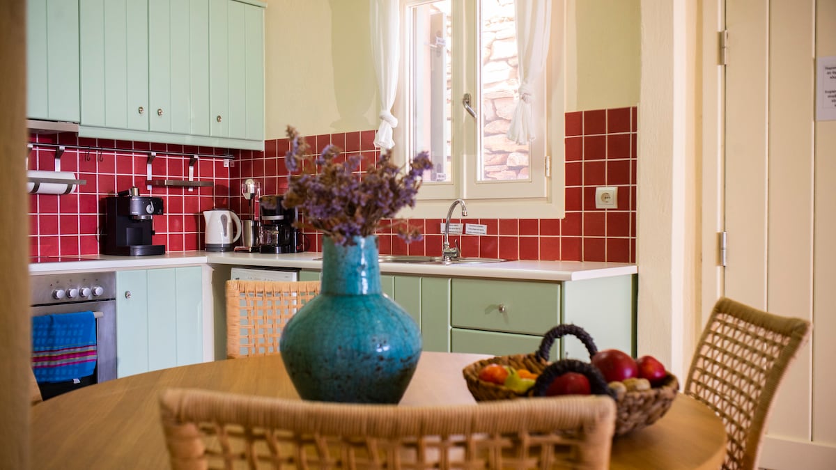 This cottage features the color of pomegranates in the kitchen and living room and spices in the bedroom, producing an oriental ambience that creates sensations of warmth, elegance and serenity.