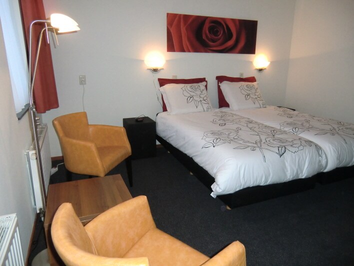 Private entrance on the ground floorSleeping / living room with 2-person seat & 2 luxury box-spring beds.Desk, minibar and kettle, flat screen TV / DVD player,Alarm radio, cupboard with safe and hair dryerLuxurious bathroom with bath, shower, toilet and sink.2 seater outside in front of the hotel room.Free internet and option for breakfast buffet (to be booked in advance)