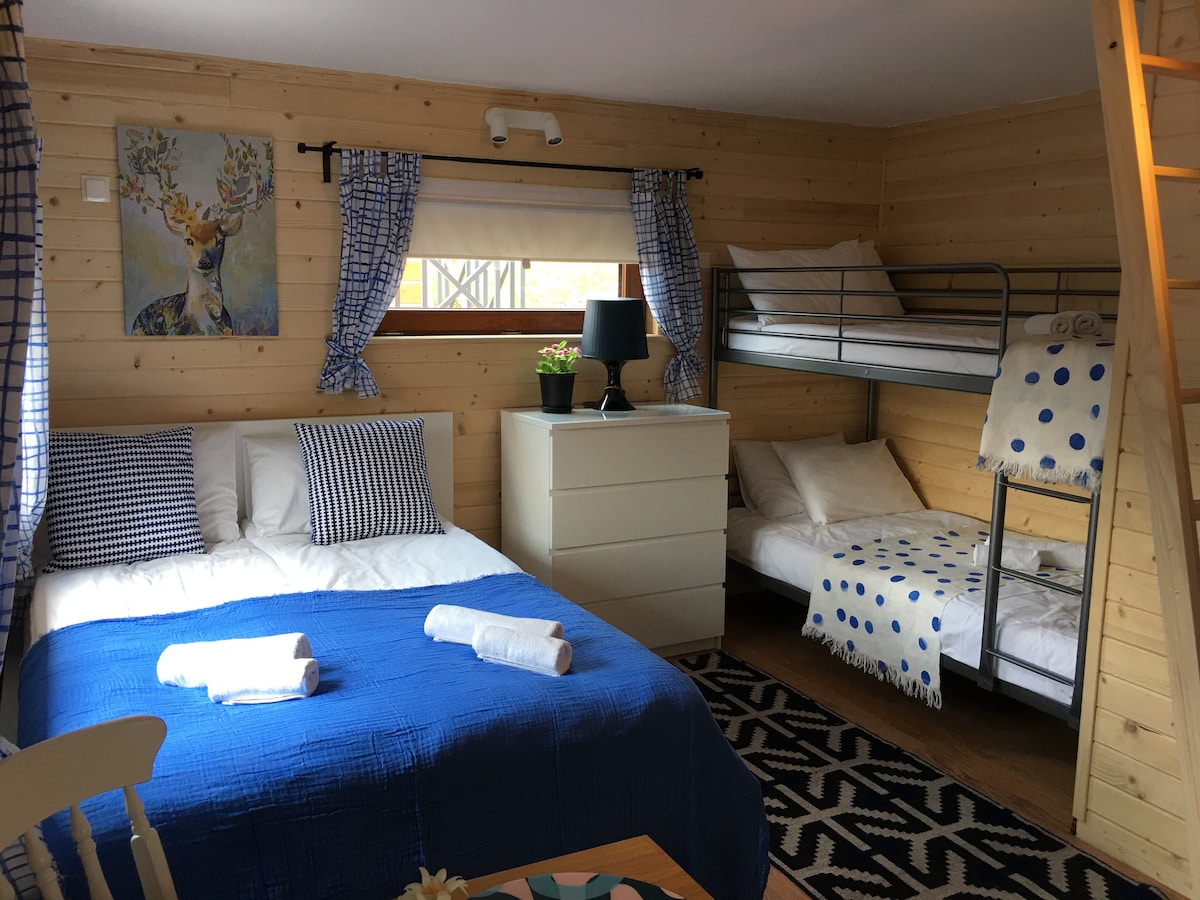Luksusowy obiekt, gdzie wspólnie z rodziną i przyjaciółmi przeżyjesz niezapomniane chwile. Ustronna lokalizacja, na łonie natury pozwoli oderwać się od zgiełku codzienności. Poza nietuzinkowym designem domku, oferujemy naszym gościom szereg urozmaiceń. W trakcie gdy twoje dziecko bawi się na naszym placu zabaw, ty możesz zrelaksować się w saunie i jacuzzi. Nasi goście mają również możliwość skorzystania z grilla, którego mogą rozpalić przy przestrzennym tarasie.