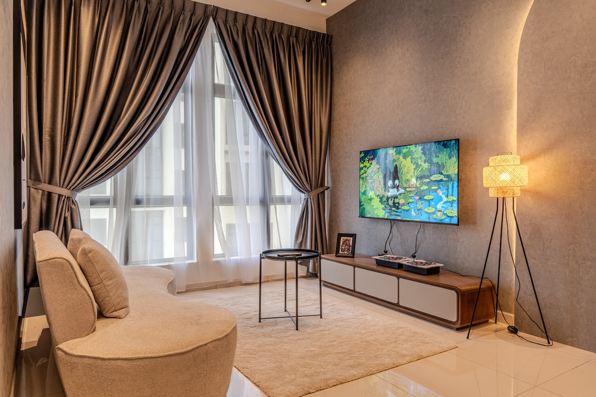 Private Luxury Suite | Walk to KSL Mall • Walking distance to KSL Mall • MUJI-inspired minimalist design • Private Jacuzzi for relaxation • Immersive cinema with surround sound • King-size bed with 12-inch premium mattress • Plush high-end sofa Designed for comfort, privacy, and quiet luxury. Ideal for couples, special occasions, or guests seeking a refined and uninterrupted stay in the heart of Johor Bahru.