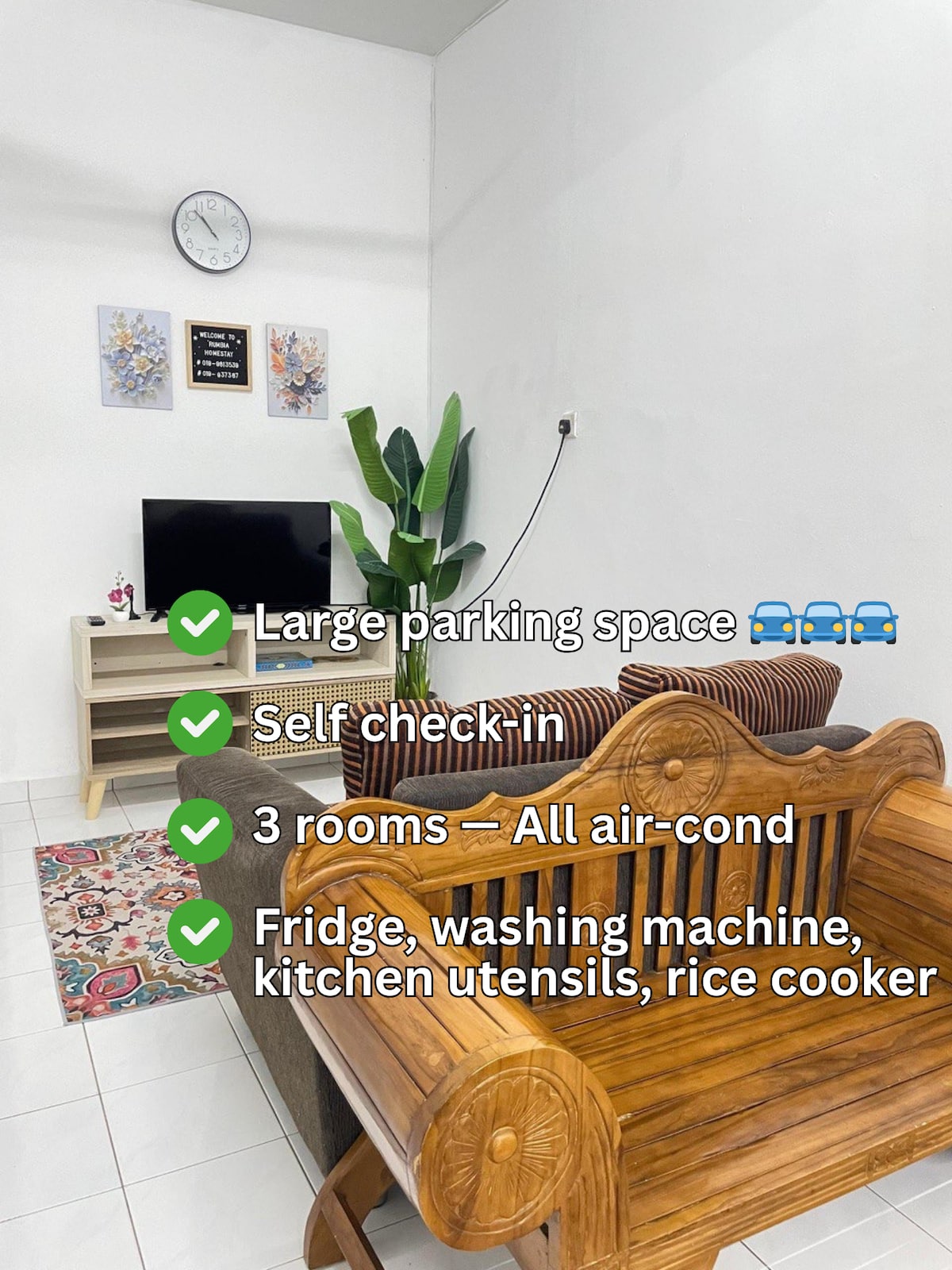 INS Homestay (Full A/C - Living room & 3 Rooms) - Home with quality furniture (Single Storey) - 3 Bedrooms with Air-Cond - Cater up to 10 People - TV - high speed WIFI - Air-cond Living Room - Air-cond Family Space - 2 Bathrooms with Water Heater (Rain Shower) - Clean towel - Body wash hair shampoo & conditioner, hair dryer - Drinking water - Kitchen with Fridge - Light cooking with electric stove (Frying charged extra RM100/night) - Washer - microwave (upon request and availability)