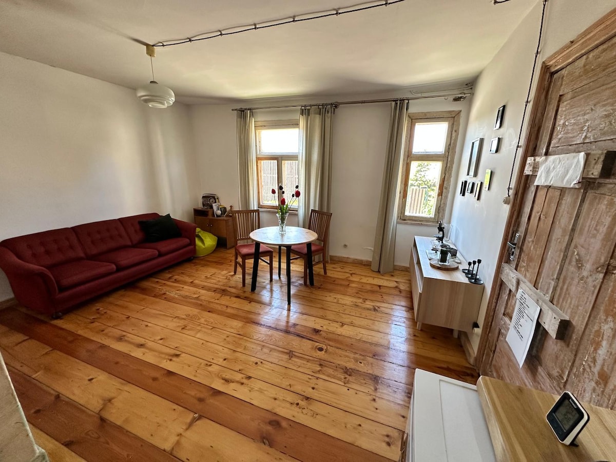 Charming studio apartment in wooden building, built in 1856 and located in a very old town. This 37 sqm space boasts equipped 60-tie’s style kitchenette, queen size bed and a big bath. The place is furnished with selected furniture of different decades.