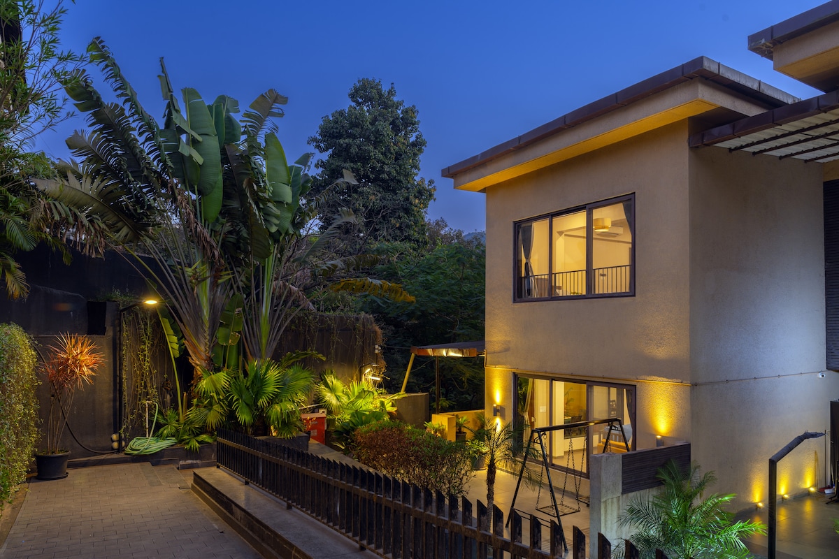 'Villa Elsewhere' is a luxurious, beautiful, private pool villa, just 60-90 mins drive from Mumbai. Surrounded by lush green views of fields, hills, and sounds of nature. The Villa has 3 AC en-suite bedrooms, a large AC living room that opens into a private pool and large deck with a Bar. The kitchen is fully equipped where a chef can make delicious meals (*extra charge). It is pet friendly (*extra fee). BOOK to relax in a calm peaceful vibe, for a get together, or to host the best part ever!