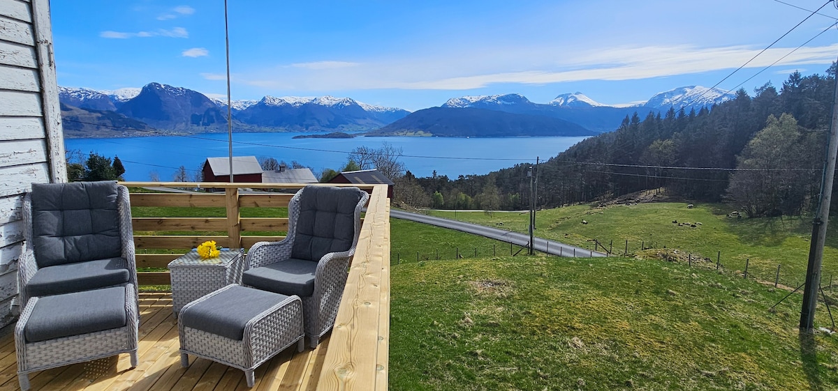 Apartment by farm, fjords and mountains.