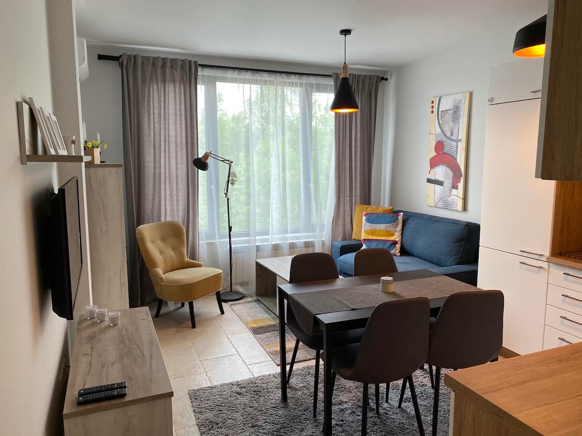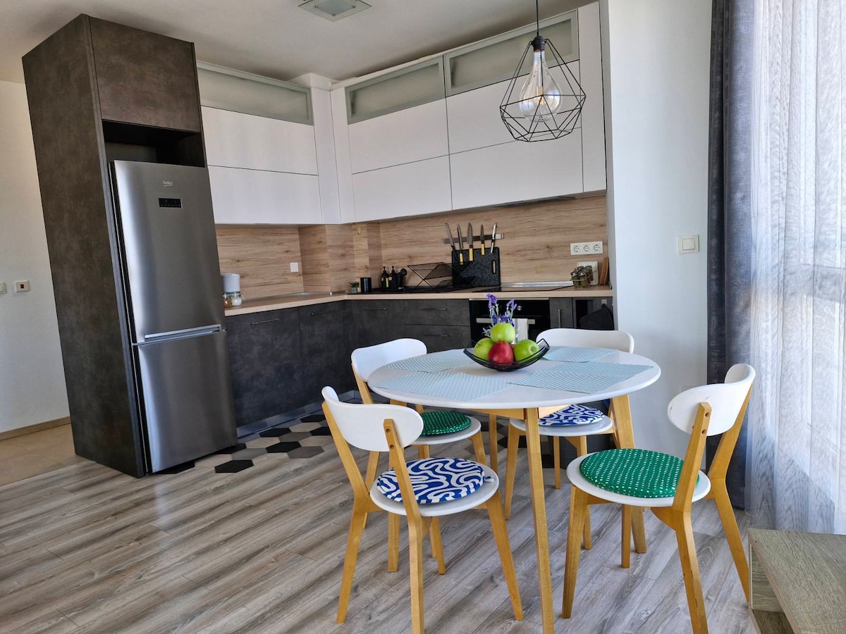 A brand new inviting apartment with a great view of Vitosha mountain. Furnished in a contemporary interior style, which makes it feels airy and spacious. The apartment is located in a private complex, on the 9th floor. A cozy and comfortable place! Just 8min walk from Inter Expo Subway Station and 10min away from the city center by car. It is also convenient to get to the airport, both by subway and taxi.