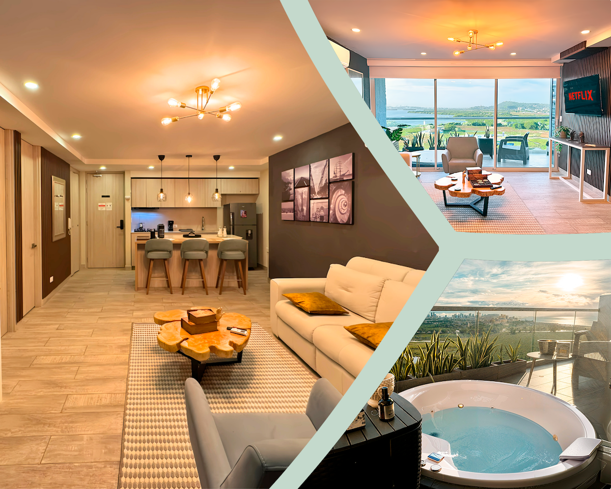 Hermoso apartamento de 1 habitación, 2 baños y jacuzzi privado en el balcón, ideal para parejas y pequeñas familias que buscan disfrutar Cartagena con las mejores vistas hacia el Mar, la Ciénaga de la Virgen y el Viaducto. El apartamento está ubicado en Zona Norte, a pocos metros de Playa Azul, a sólo 5 minutos del Aeropuerto, 10 minutos de la ciudad amurallada y 1 hora de las islas. El Edificio cuenta con 2 piscinas, 2 jacuzzi, gimnasio, terraza mirador, BBQ y parqueaderos.