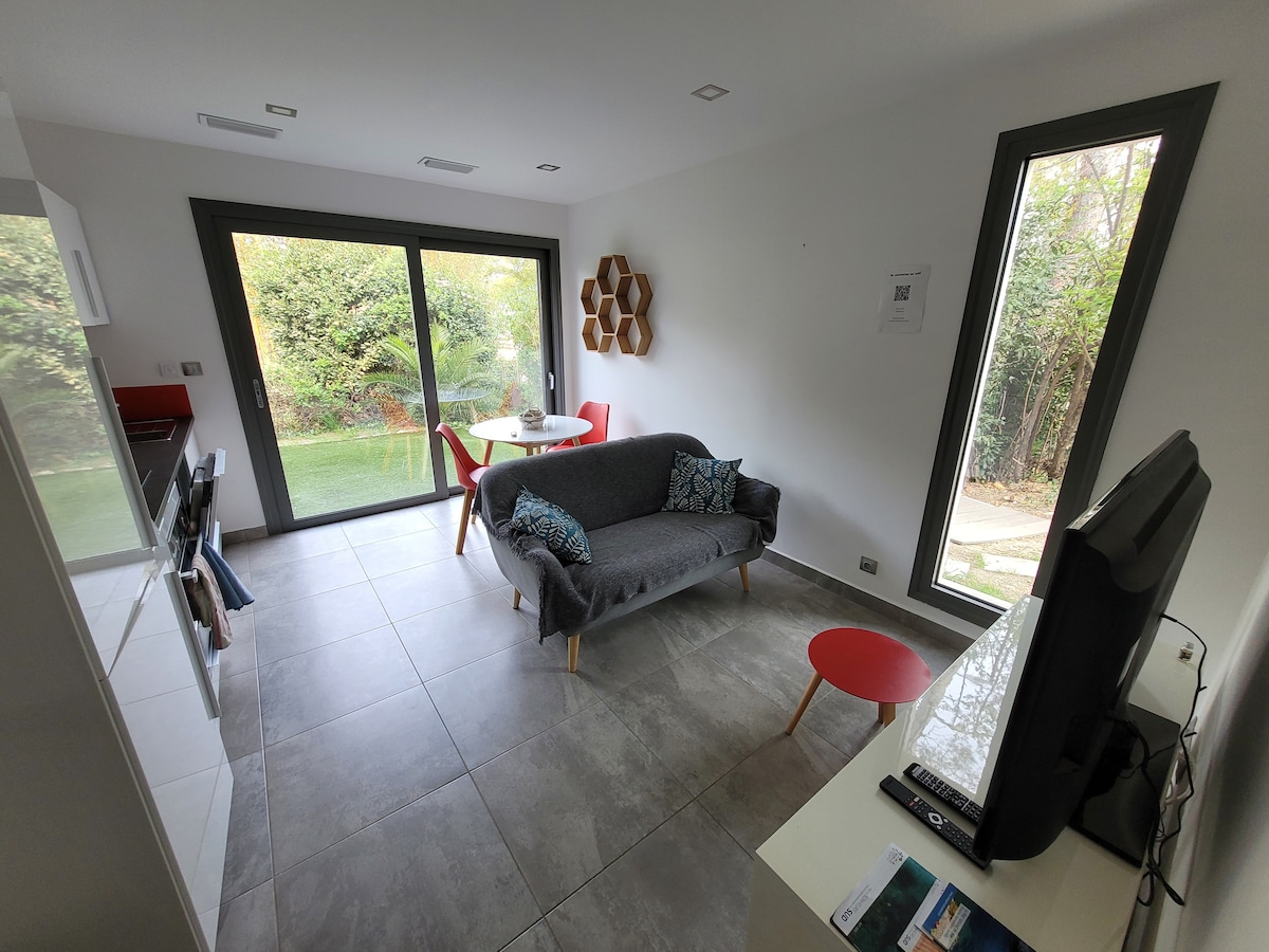 Dans quartier paisible, logement de 30m2 (climatisée) avec jardin privatif de 40m2. Belles prestations. Ce logement à la décoration zen et soignée est un réel havre de paix. Avec son extérieur arboré de plantes exotiques, ce lieu calme et paisible vous apportera bien-être et sérénité. Vous pourrez aussi profiter d'un moment de détente au bord de la piscine. Pour rester dans l ' ambiance, sur place et avec un supplément, vous pourrez bénéficier d' un massage bien-être.
