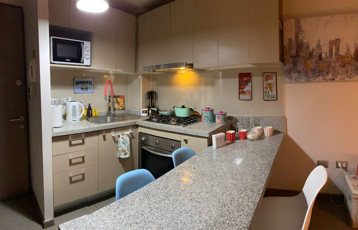 Kick back and relax in this calm, stylish space. discover the comfort of this new apartment in Santiago de Chile. WITH PARKING ideal for up to 2 people. It has 1 bedroom, bathroom, full kitchen, terrace, 5G Wi-Fi, 55 inch TV. The building offers a swimming pool, gym, gazebos and bicycle racks. STEPS AWAY FROM EL PARRON METRO STATION. In its surroundings you will find: bars, 24-hour food places, pharmacies, supermarkets, restaurants. YOUR PERFECT CHOICE