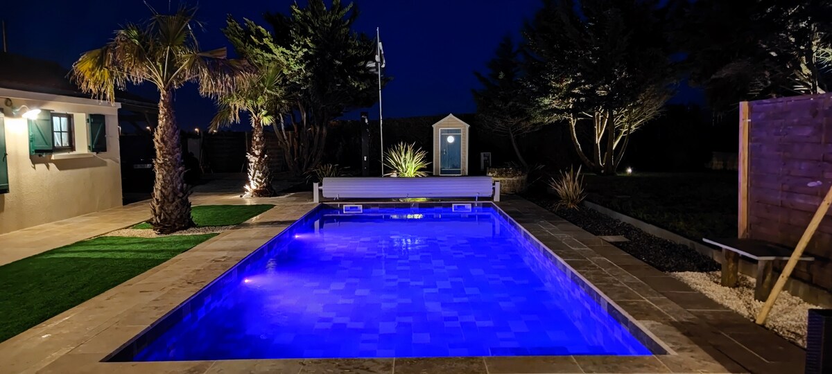 Villas Véronique, a piece of paradise on Ile de Ré. A unique place for a new approach to luxury. Beautiful villa with private heated pool with sea 50 m away. The living room is open to the outside. A bedroom with a double bed and high quality bedding connects to the living room through a large carved rosewood door. The second bedroom has a single bed. The bathroom has a natural stone walk-in shower.