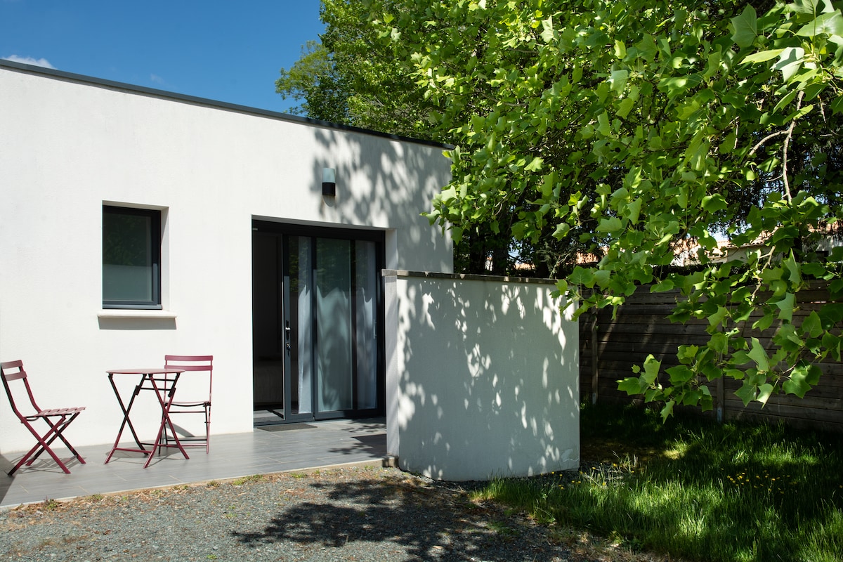 Enjoy a quiet and stylish space. This 35 m2 house will bring you all the comforts: on the ground floor a beautiful living room with its fitted and equipped kitchen overlooking a private terrace, a toilet and washing machine. Upstairs: a bedroom with a double bed, shower, closet, additional desk Linens and towels can be provided but only on request. Free Wi-Fi access. Free parking. We pay special attention to cleanliness.