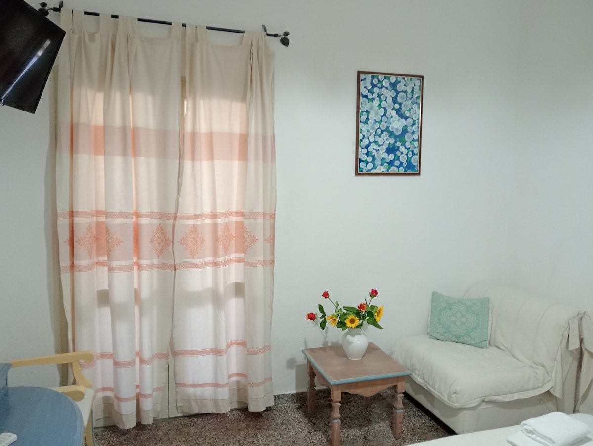 The Italia room is located on the second floor (no elevator) is large spacious with a double bed and two single beds. Suitable for families, it accommodates up to 4 people. It has a private bathroom, but it is not located inside the room, in fact you have to cross the common room to access it. It has a small balcony overlooking Via XX Settembre, one of the main pedestrian streets on the island. Independent air conditioning (hot/cold) and 40" LCD TV.
