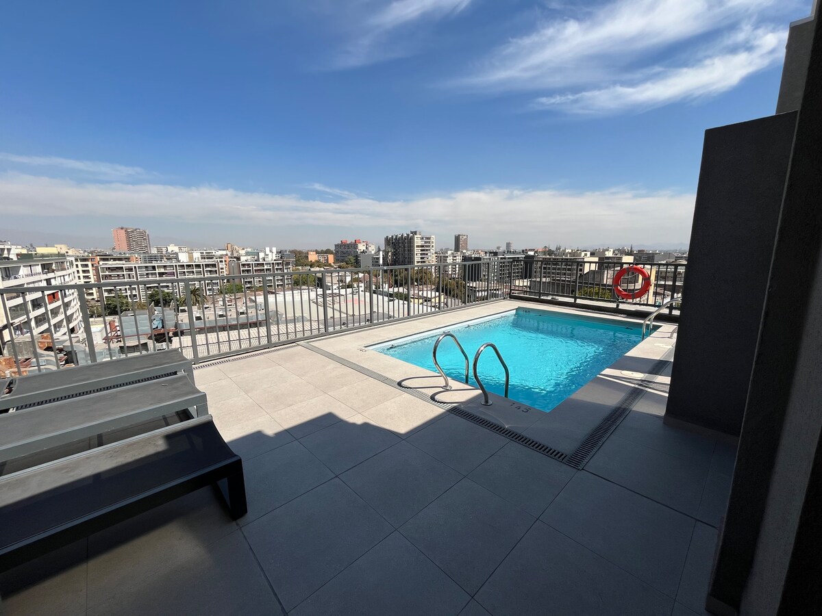 Modern and cozy apartment in downtown Santiago - Ideal for exploring the city ✨ 👉Fully furnished and equipped, ideal for short or long stays. 👉High-speed Wi-Fi, perfect for remote work. 👉50-inch Smart TV with access to streaming platforms. 👉Access to public shared areas such as swimming pool, living room and two barbecues. 👉Comfortable bed base with soft bedding and excellent hotel quality. 👉Modern bathroom with good hot and cold water pressure.