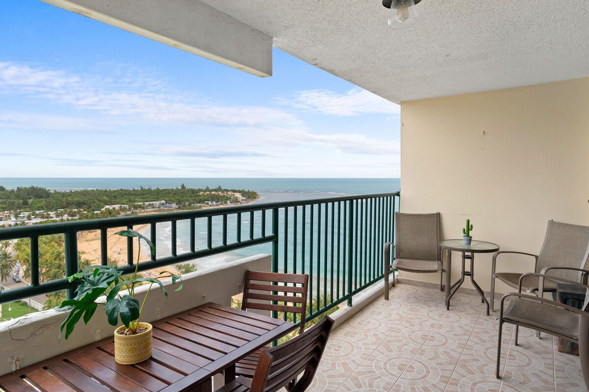 A million Dollar Ocean View! Puerto Rico awaits!!! Treat yourself to an unforgettable retreat: A one bedroom condo with spectacular portrait ocean views; so mesmerizing; such a gem. Fully equipped with washer and dryer,AC; a full kitchen to provide you with all comfort for your stay. We take pride in our cleanliness, spect nothing but perfection; rest in such lush decor to make you feel lost in this oasis suite. Your satisfaction is our goal!