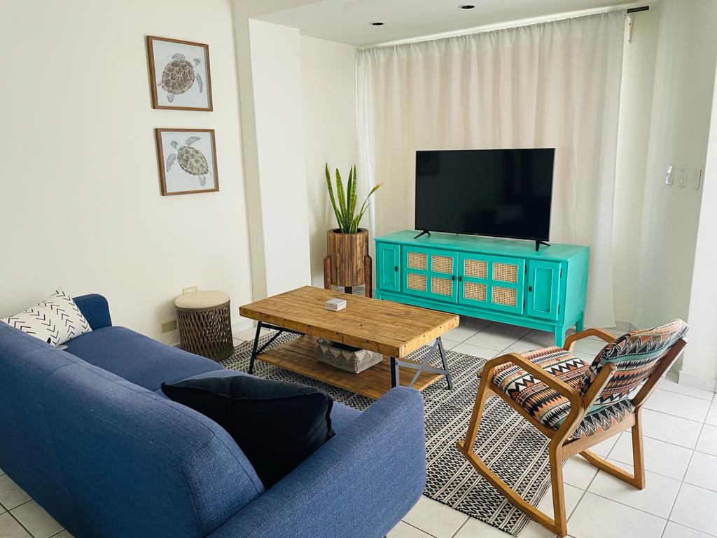 The Casita Caracol is a loft-like space, super cozy, with a king-size bed and a sofa bed on the 2nd floor. Downstairs there is a full kitchen, bathroom, dining room, and living room. The loft has Wi-Fi and air conditioning. It also has a laundry area and a closed garage for guests. It is located in a very quiet area, 600 m from a beach perfect for walking and watching the sunset. The boardwalk is a 10-minute drive away, as is the airport. You can use the shared pool in the apartments next door.