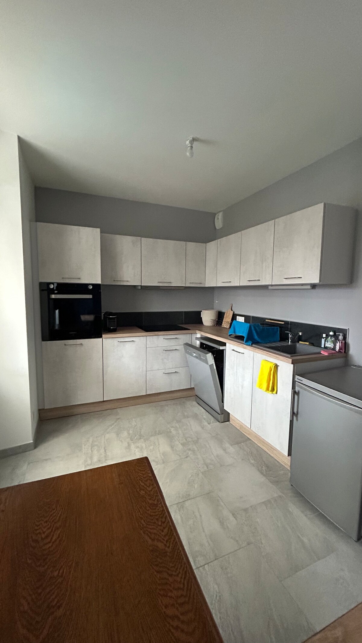 This apartment in the heart of La Roche-sur-Foron ** * refurbished in 2021, near Gare and RocheExpo *** is located at the crossroads of Haute-Savoie and Greater Geneva. This home is bright, modern, functional, and has quality amenities. It has a large separate bedroom with a double bed and dressing room. Large living room – open-plan kitchen – with a sofa bed or a mattress providing 1 80 x 200 cm sleeping space, a bathroom with a walk-in shower and toilet, a flat-screen TV, and Wi-Fi.