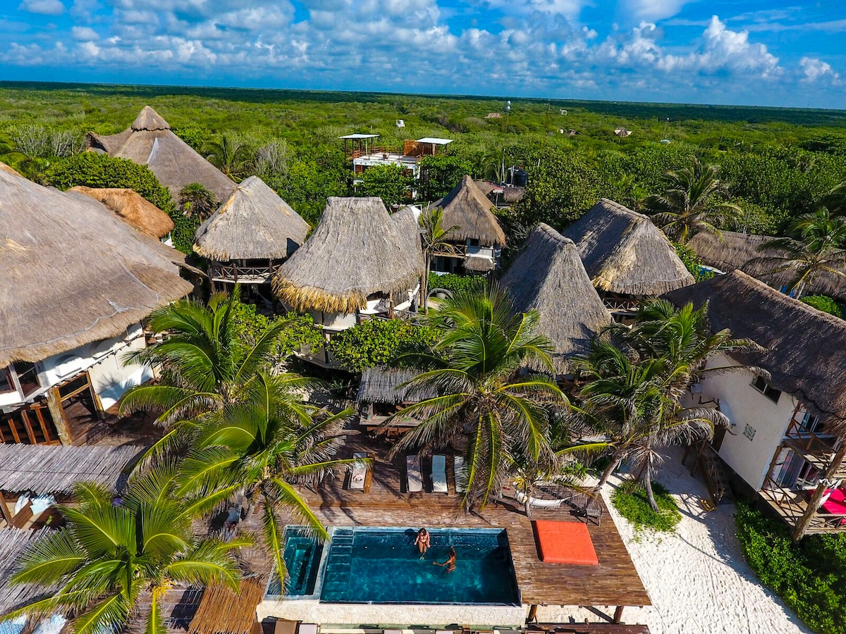 Some say is a lottery win for their stay, others a hidden gem, and even Heaven on Earth. We believe that what makes us special is the spirit of finding what Tulum used to be: boutique, rustic with intimate private beach club surrounded by tropical jungle with no neighbords, and a truly personal touch. Located in the Reserve of Sian Kaan, only 1 minute drive, means away from the hussle of the busy and noisy area, but close enough to walk, bike or drive when you choose to.
