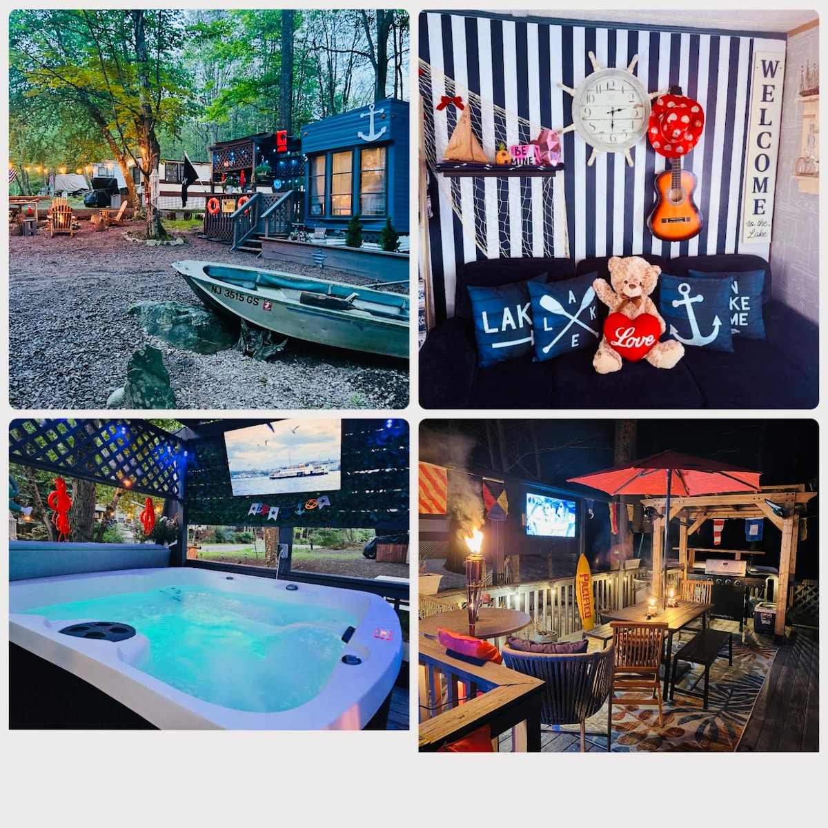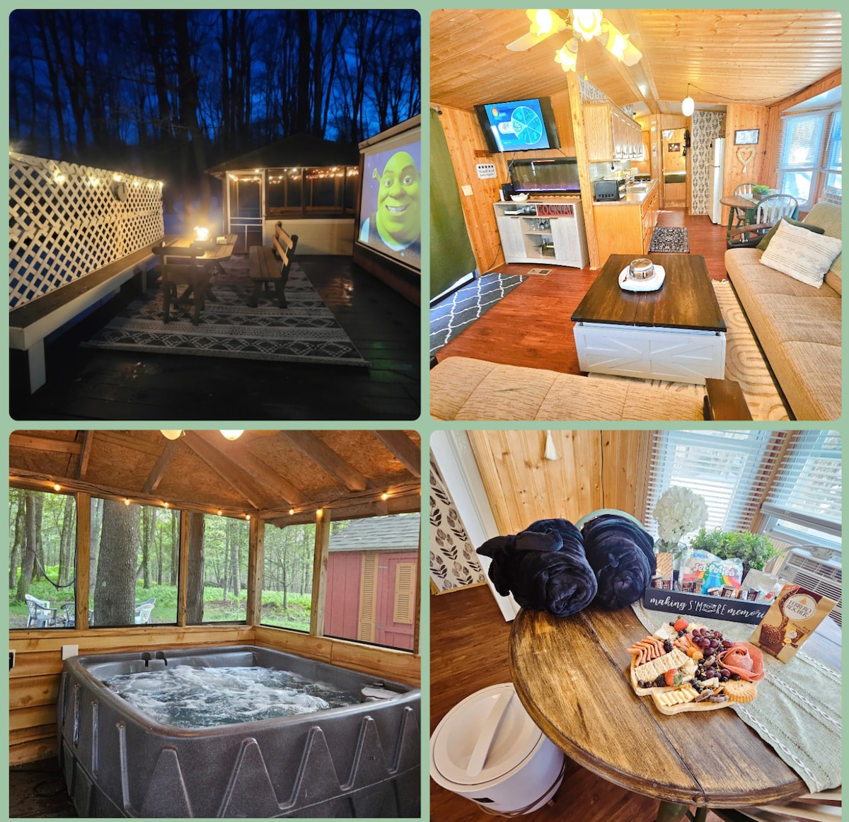 *Outdoor projector is here!* This spacious tiny retreat is fully stocked for a memorable family vacation or a romantic couple’s getaway. Soak in your private hot tub, toast s’mores by the fire, sway in the hammock under the stars, or stay in and enjoy hours of gaming on our new Nintendo Wii. Enjoy access to 2 beaches, an Olympic-sized pool (seasonal) mini golf, tennis courts & more. Just minutes from Pocono favorites like skiing, casinos, and waterparks.
