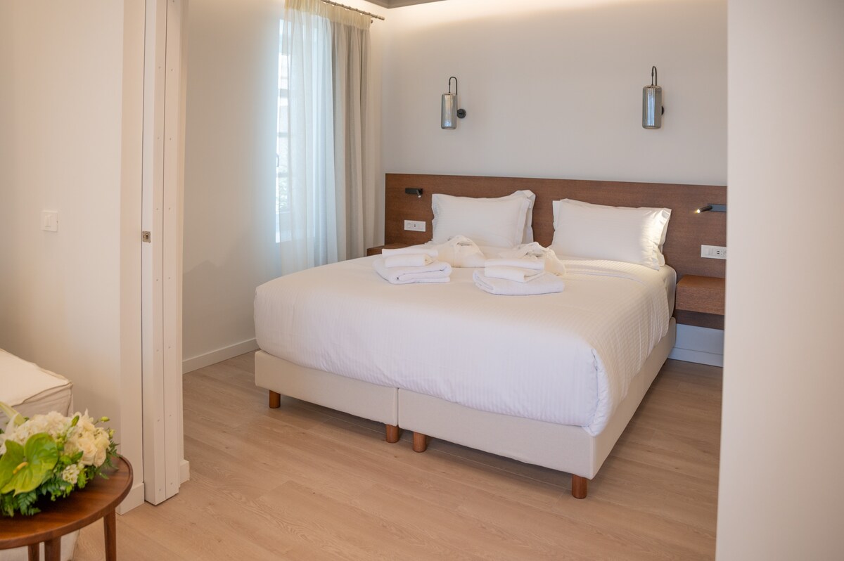 Elegant and thoughtfully designed, this 37 sq m. The suite accommodates up to 3 adults. It features a double bed and a high-quality sofa bed (90x200 cm) with an extra topper. The 12 sq m. semi-covered balcony offers peaceful garden views, while the modern interior creates a tranquil, airy space.
