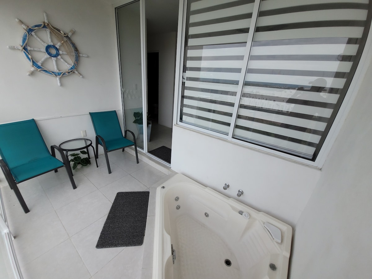Beautiful apartment in a residential area, 8 minutes from SKYDIVE and JARDINES DE MEXICO with a lake view and private dock. You can rent motorcycles and boats without leaving the residential area. HEATED pool and jacuzzi. WIFI and NETFLIX, 24-hour private security, parking for 2 cars, bedrooms with AIR CONDITIONING, 3 screens, jacuzzi on the terrace, 2 full bathrooms, washing machine, microwave, blender, coffee maker, stove, dishes, glasses, pans, towels, toilet paper.