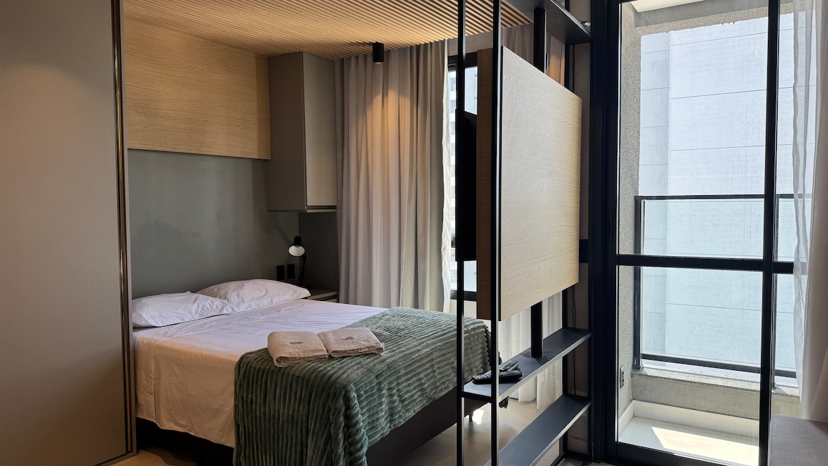 Flat at Tropical Executive Hotel beautifully designed with gorgeous river views. Bedroom with air conditioning, an Ortobom queen bed and an extra bed, 55” TV, Wi-Fi, 2-seat dining table and a beautiful themed painting to record your visit to Manaus. Sometimes it is possible to see dolphins in the river. We have a hairdryer, steam iron, water purifier, Dulce Gusto coffeemaker + capsules, microwave, 2 mouth cooktop, blender, pots, cutlery and utensils, refrigerator and TV.