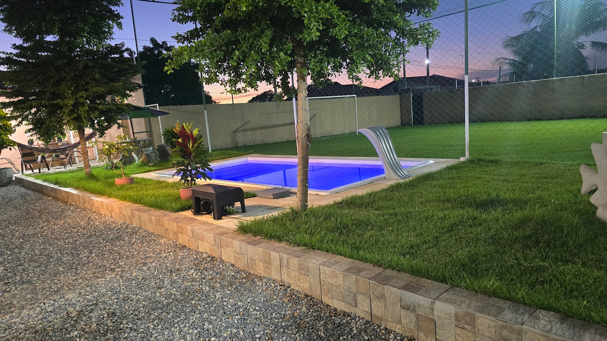 3-BEDROOM OPTION If you want to party, this isn't the ideal place. Family atmosphere. I DO NOT allow extreme noise. We have 3 suites It is also possible to set up 12 hammocks in the outside space and 5 in the bedrooms. 2 air conditioners, one in each room Deck equipped with: Barbeque Freezer Mesa for 8 Extra Kitchen We have an external bathroom and a shower Sinuca At the moment we are not providing hammocks, sheets and towels, only pillows and bedding!