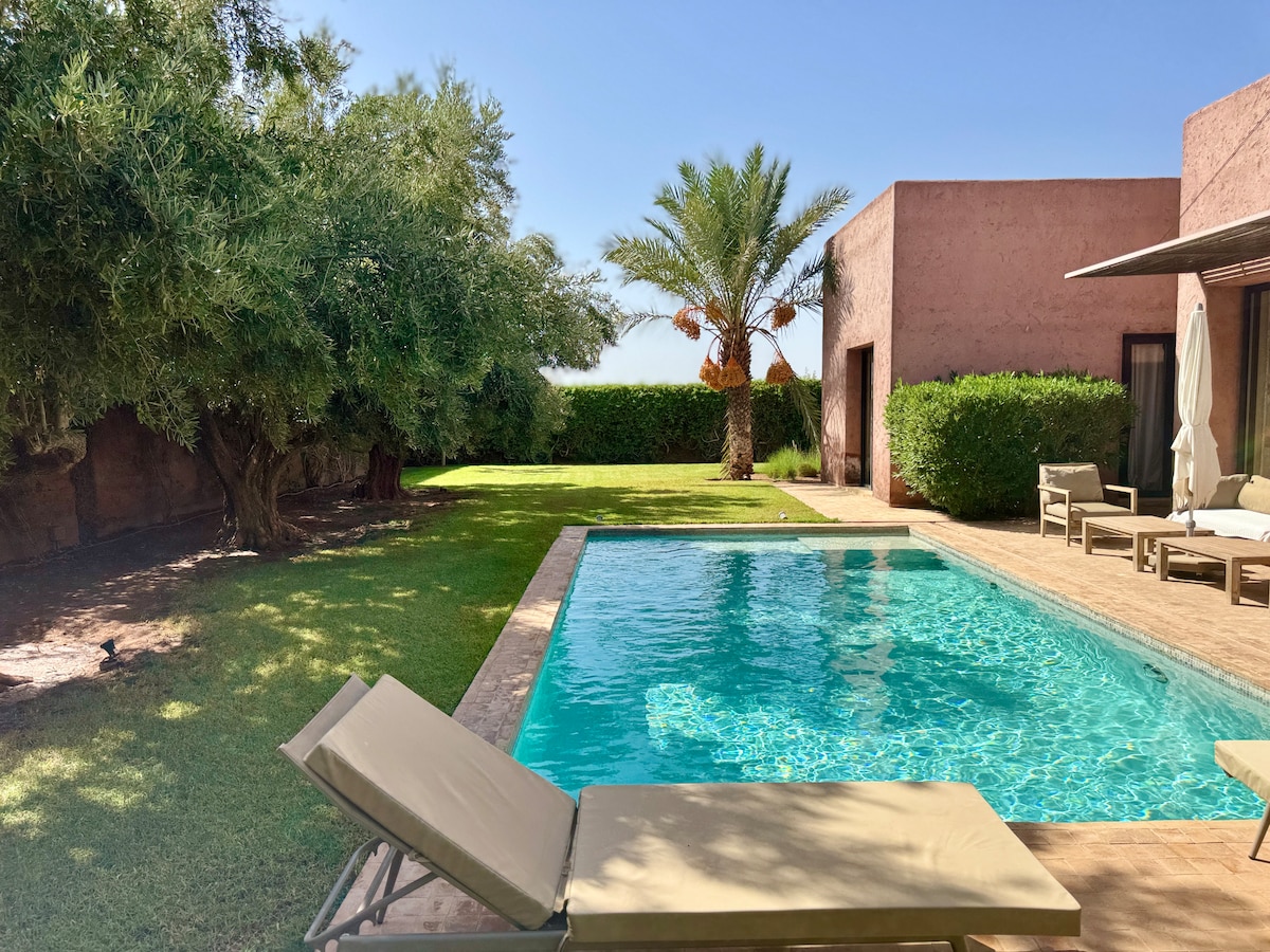 It is a 5 bedroom villa plus 5 bathrooms, on 5000 m² of garden, 400 m² habitable. With A PRIVATE 15 m x 7 m SWIMMING POOL and a fenced private garden. It has a living room, dining room, equipped kitchen, hand washbasin and toilet, terrace with Atlas view. A FREE 14-seat shuttle is available daily before 7 p.m. to downtown Marrakech. catering, cleaning and cooking are available daily on request, with Hammam treatments and massage.