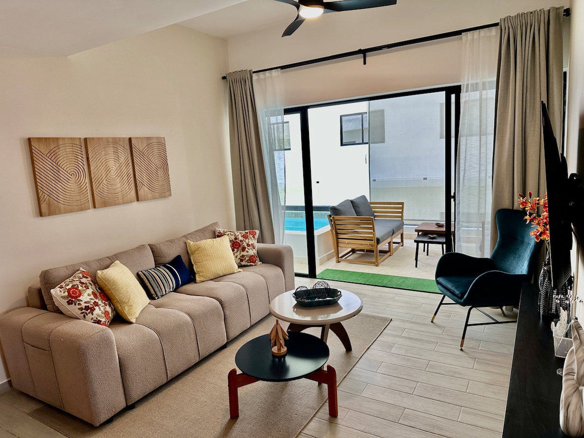 🌴 Welcome to your tropical retreat in Punta Cana. Discover a space designed for you to relax from the first moment. This cozy apartment combines comfort, style and privacy, ideal for getaways as a couple, with family or with friends. From the terrace to the backyard, every corner has been designed for you to relax without rushing. Outside, the pool and gazebo invite you to immerse yourself in a serene environment, surrounded by tropical calm.