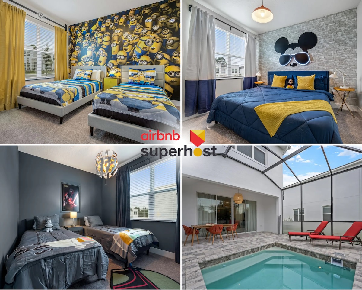 Welcome to your perfect vacation home for 9! Immerse yourself in comfort and luxury in our extraordinary home. Transport your guests into a world of magic as they choose to sleep in the Minion's or Mickey’s room, where each room offers a world of enchantment and imagination. Enjoy the Florida sun or take a refreshing dip in the private pool on the screened patio, perfect for outdoor dining. *Themed Breakfast service is optional at an additional fee. Get in touch for more details.