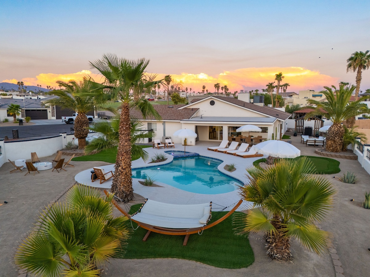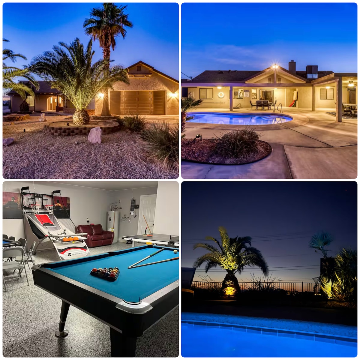 Welcome to the Ace of Oasis, a light-and-airy vacation home with private backyard, pool, and view of the mountains! Home is centrally located and within minutes to Lake Havasu, golfing, casino, and the London Bridge dining and entertainment district. Don’t feel like leaving the house? Enjoy the in-ground pool (heat optional), in-pool tanning ledge, lighting effects, custom hot-tub, shaded patio, BBQ grill, and Foosball. Relax inside with modern decor, internet, and Smart TV’s in every room.