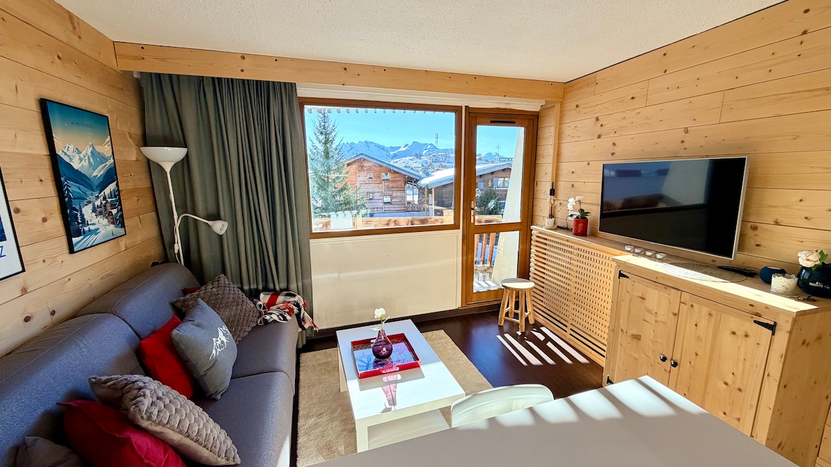 Magnificent apartment completely renovated in 2021, in a "mountain chalet" style for 6 people with stunning south-facing views. Located in the old Alpe, in a peaceful residence, on the -2th floor. It is composed of1 adult bedroom with a south facing view, 1 bedroom with 2 bunk beds, 1 fully equipped kitchen, 1 bathroom with shower & toilet, storage Equipped with 1 washer/dryer The living area has 1 sofa bed + TV Dedicated ski locker, building entrance