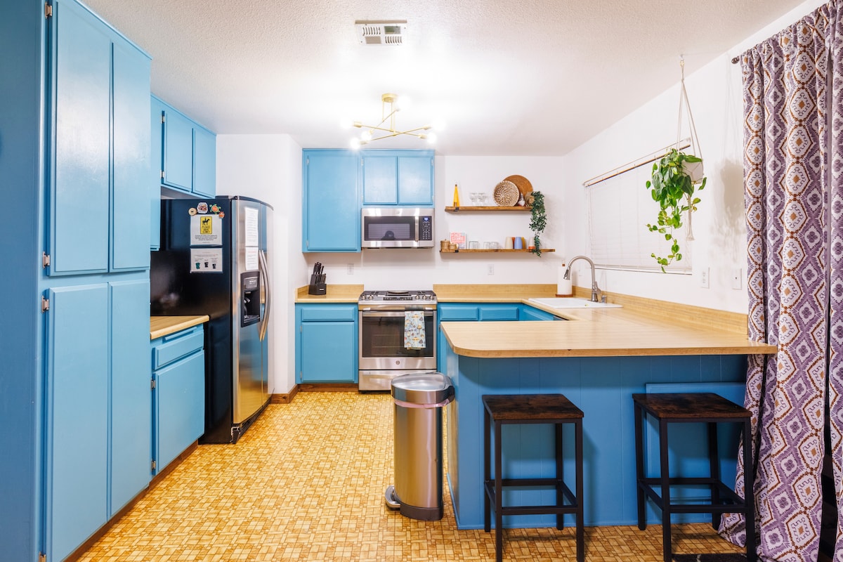 ✨Create unforgettable memories at our unique, family-friendly home! This vintage-themed gem offers mid-century modern flair and sits on nearly an acre of peaceful land. Perfect for large families, our spacious 4BR, 2BA house sleeps up to 10 guests, and has a pac-man arcade machine. ☀️Conveniently located less than a mile from excellent dining and grocery stores, you’ll have everything you need within reach. Start your mornings with a beautiful view of neighboring houses and their lovely horses.