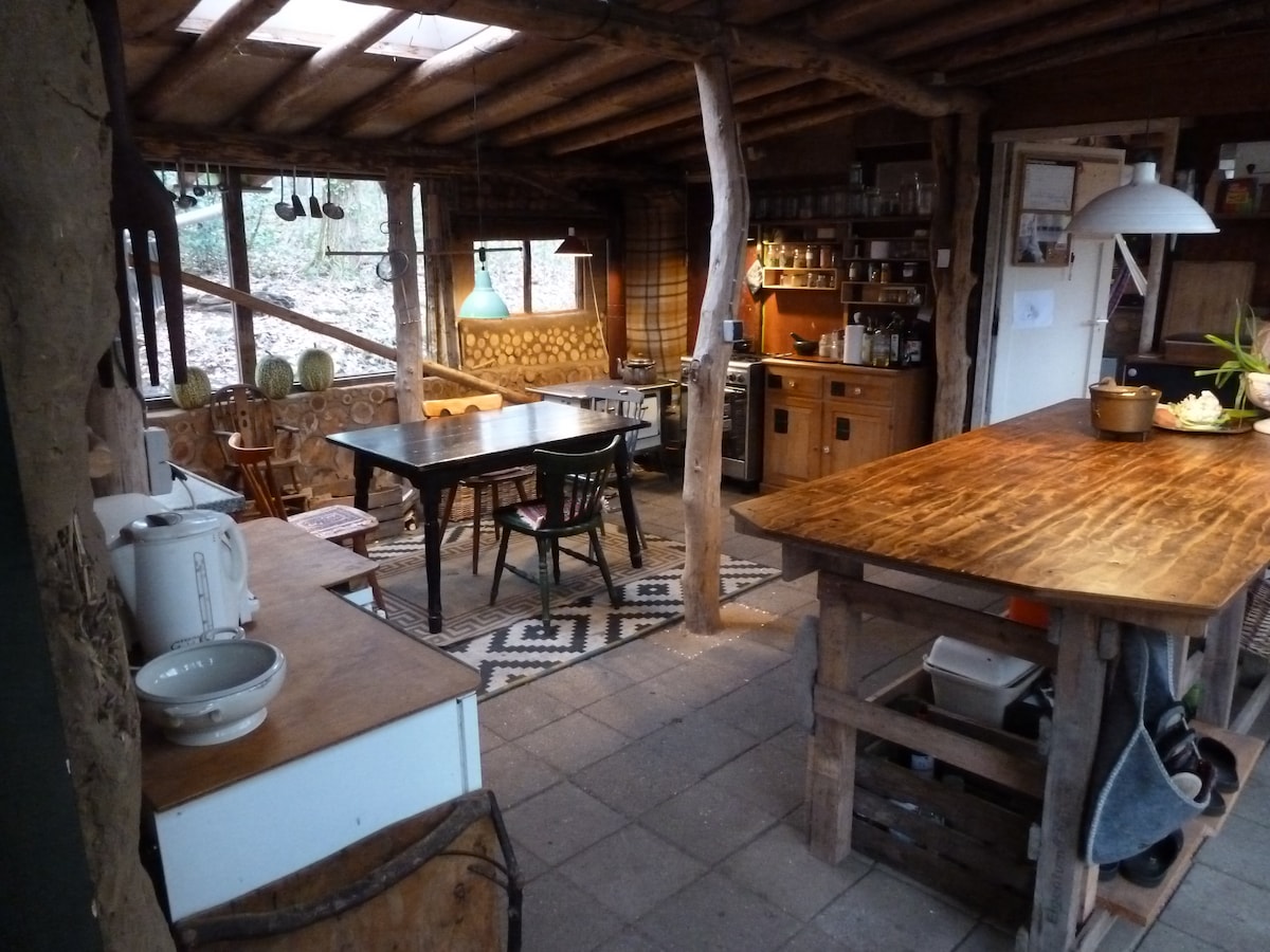 A beautifully & atmospherically built cozy cottage, with lots of glass so that when you are inside by the wood stove, you can still enjoy the nature outside. The cottage is built with oak from the land and loam from the Maas nearby. The construction is made with so-called pin hole connections & the walls are filled with loam & straw, which together gives a very unique & natural impression. Upstairs in the comfortable double bed, you have amazing views over the countryside. Maybe you'll see a deer!