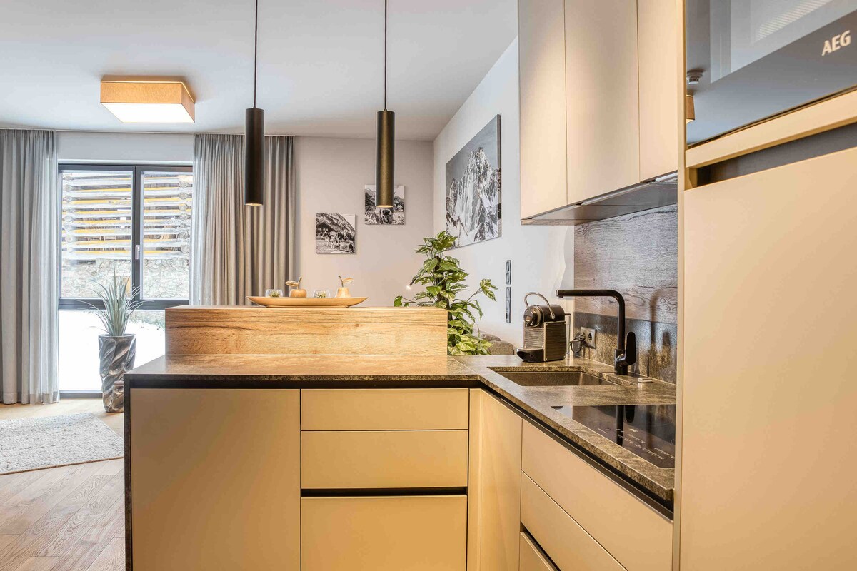 This intimate, modern and valuable one-bedroom apartment on the second floor of the residence offers a spacious living room with dining area leading to a modern, fully equipped kitchen. After a sporty day - skiing or hiking on the alpine pastures you can relax with a cocktail or hot drink on the sofa or on the private terrace.