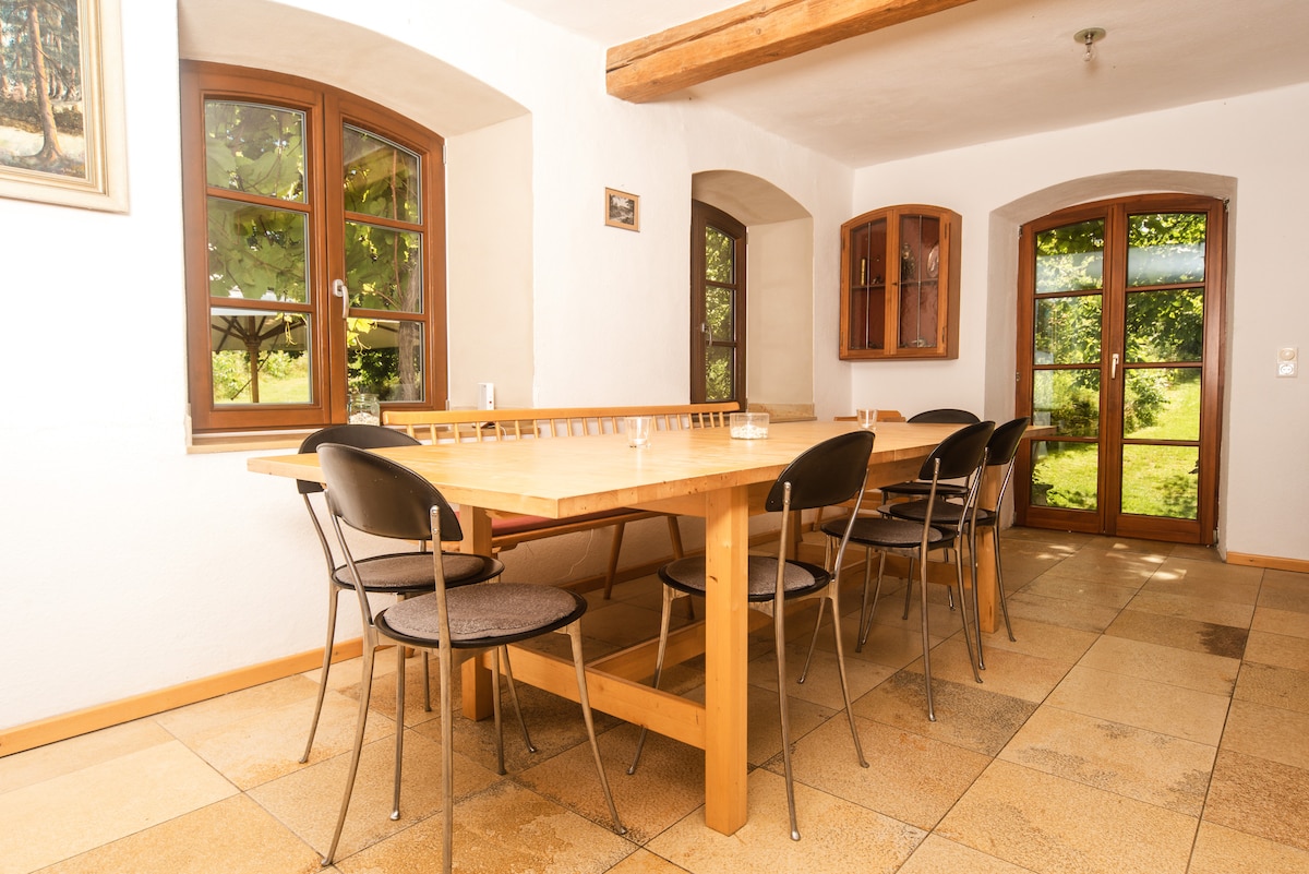Cozy house on an old estate located directly on the Romantic Road. The house is surrounded by large old trees and can accommodate up to 9 people. 1 bedroom with double bed on the ground floor, living room, 1 bedroom with double bed and sofa bed on the top floor and gallery with 2 single beds and sofa bed on the top floor, kitchen, bathroom with toilet and shower, guest toilet, dining room, terrace with large garden.