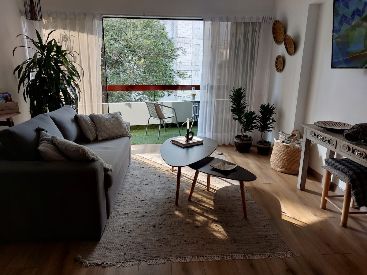 Great independent apartment with: 1 bedroom with queen size bed; bathroom; living room; equipped kitchenette; laundry and large terrace. All private, on the third floor of a new building. (in Peru 4th floor). No elevator. With a wide staircase and a 24-hour doorman who helps with luggage. Excellent location: 1 block from the MalecĂłn (esplanade) overlooking the sea; 3 blocks from Parque del Amor; 4 blocks from CC Larcomar, 3 blocks from Av. Larco and 6 blocks from Parque Kennedy. Cable TV and WiFi. Spanish, English, Portuguese. Ana