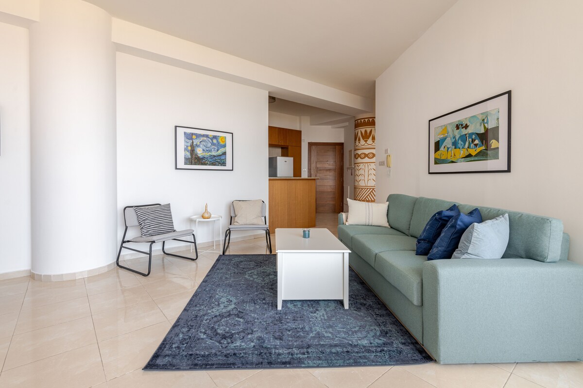 3 MIN WALK TO THE BEACH! One of our most popular flats, 150m from Finikoudes. Total bathroom renovation, as well as all windows replacement in June 24. Close to cafes and restaurants. Bus stop outside the building for Larnaca, the airport, or other towns. Great for couples, solo adventurers, and business travelers. Recently renovated bathroom and new windows, stylish contemporary furniture & appliances. Free unlimited 200/20Mbps wifi & cable TV. To see more flats of ours, go to our profile.