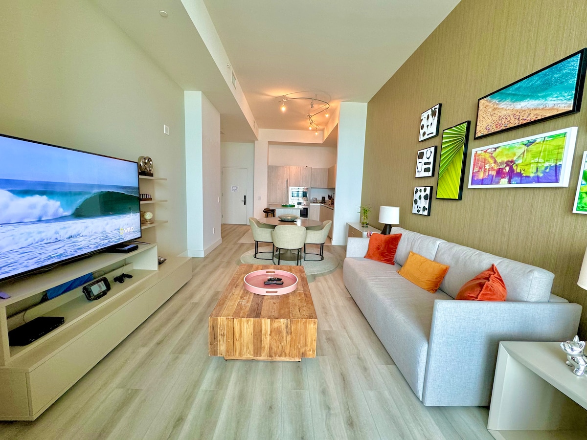 This ocean front unit offers a breathtaking ocean view with 5-star amenities, fully furnished modern design. Wake up on the bed and see the sunrise through the balcony! 1 bedroom with 1 king size bed, 1 sofa bed in the living room with a 65” Smart TV. For your comfort the king size bed is upgraded with Tempur Ergo power base to help stop snoring, its wave form massage can also help you sleep better. Upgraded Full bathroom with luxury bidet toilet. RESORT FEE: $44/day/Room VALET: $38/day/Car