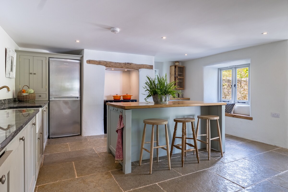 A calm, deeply luxurious space to recharge & reconnect. The Shippon is a meticulously converted cow barn with heated, polished concrete floors, gently curving deep green walls, hand-built kitchen, warmly lit reading nooks, & natural materials. Woollen blankets, feather sofa, antique Scandinavian log burner, king-size bed with French linen & down, waterfall shower, & the softest towels. Our sleepy Devon hamlet is only lit by stars at night. You might just sleep better than you have in years.