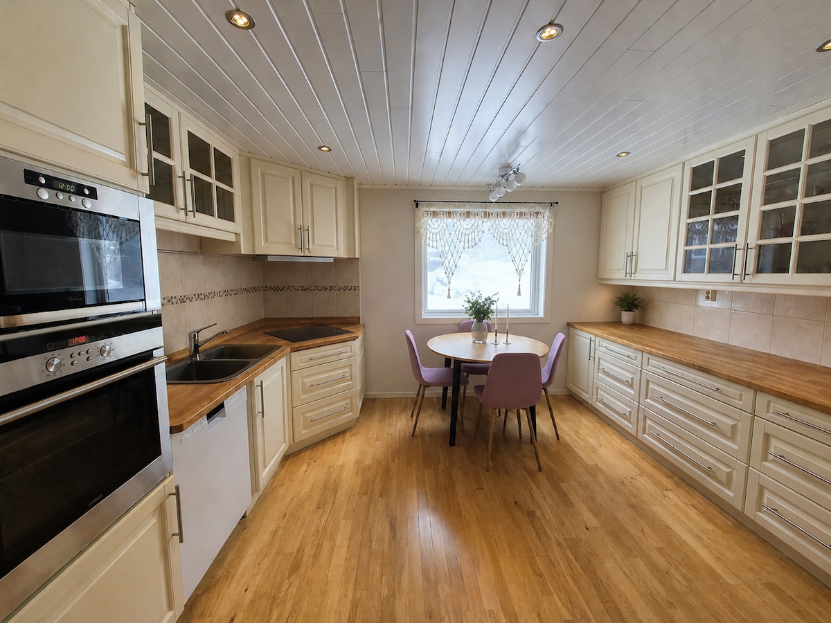 The house is a 100 years old timber house with good ceiling height. Good space, both and outdoor. Visiting farm as the closest neighbor. Nice base for excursions on southern Helgeland. The house is completely renovated on the outside and can be used throughout the year.