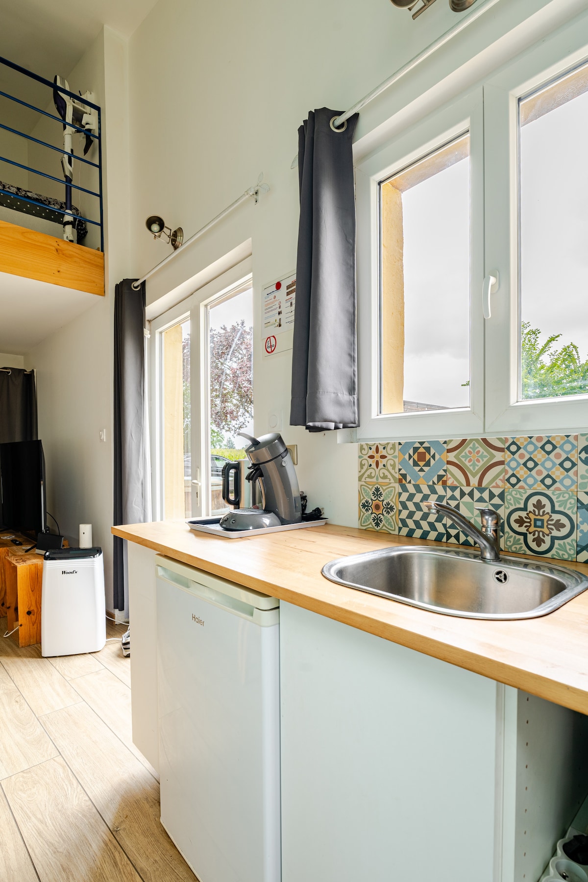 19 m2 studio, ground floor + 8 m2 mezzanine. independent entrance and self check-in (key box) 20 min to Bordeaux center 1 bed of 140 x 190 ground floor and 2 beds of 90 on the mezzanine (with steep ladder) connected TV 130 bedding and towels provided. Kitchen: high table with 4 stools, microwave, fridge, toaster, induction stove, Senseo coffee machine, dishes and cutlery. toilet, private shower room Garden furniture, outdoor BBQ area I love cooking, catering is possible on request