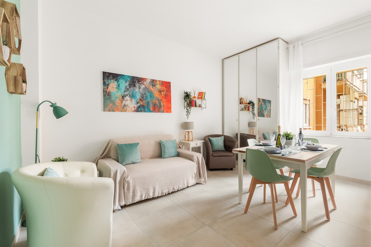 Lovely apartment in Piazza San Giovanni, in the center of Rome, it is possible to reach in 10/15 minutes historical places and monuments such as the Colosseum, Fori Imperiali, Piazza Venezia.The house is located on the second floor of an elegant and modern building, the house is composed of living room with kitchen area, sofa bed, bedroom, bathroom with large shower and a beautiful terrace.The environment is characterized by elegance, attention to detail and modern / vintage functional style.
