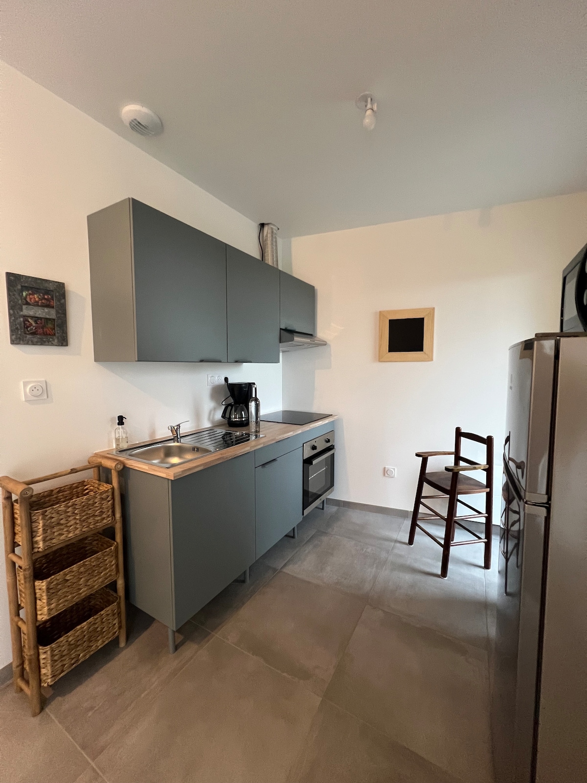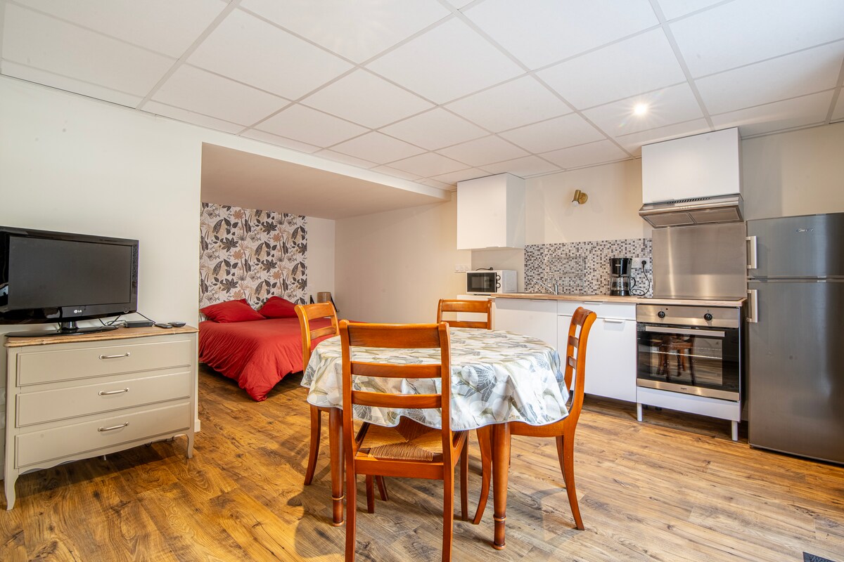 🏠 Logement Indépendant idéal pour 2/4 personnes. Composé, de plain-pied, d'une pièce de vie lumineuse de 24 m² avec cuisine aménagée et équipée, salon (canapé convertible Dunlopillo 130x190 cm) et espace bureau. D'une salle d'eau avec WC. À l'étage, une mezzanine mansardée ( ATTENTION hauteur max. 1,85m) avec 1 lit 160x190 cm et placard. Terrain privé à l'arrière, pour profiter du salon de jardin et la plancha ✅️ Linge de lit et de toilette compris, produits de première nécessité sur place.