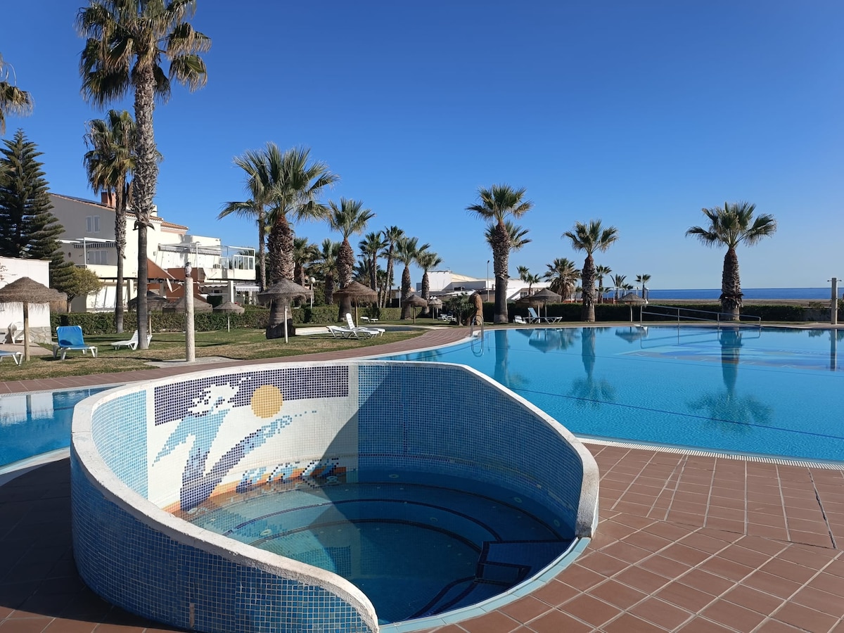 Penthouse with stunning views of the entire Mojácar Bay. All exterior south facing. It has a 40-meter terrace where you can sunbathe and enjoy the pleasant nights. The beach has fine sand. In the surrounding area, there are restaurants, cafes, supermarkets, and a bus stop. A year-round swimming pool. In July and August, I rent it by the fortnight.