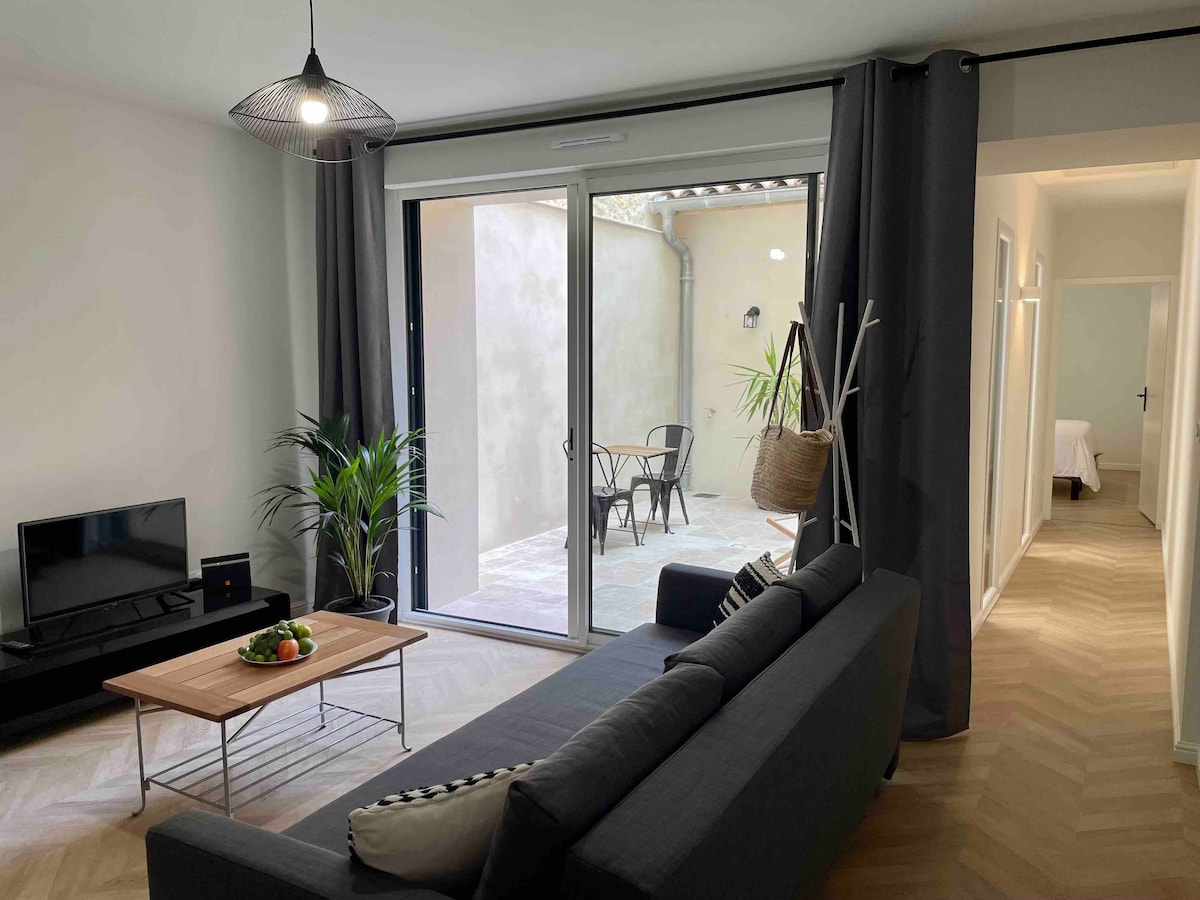 Luxury 55 m² apartment with 15 m² patio in a renovated and secure residence in the city center. It is located on the ground floor and is entirely on one level. All rooms are equipped with air conditioning/heating and electric roller shutters. This spacious accommodation is quiet while being close to the amenities of the city center. You can easily travel on foot or by bike. A bike room is also available in the building.