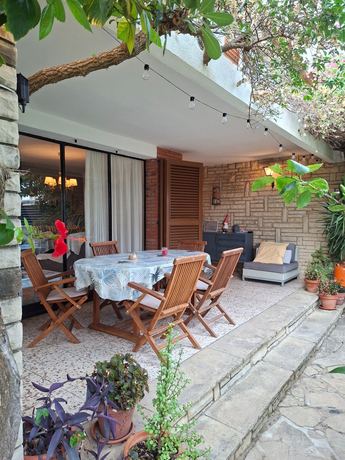 Nice house with garden in the center of Hospitalet. The house has two floors. In the main floor there is the living room with a fireplace, the kitchen, one restroom, one bedroom and the porch. In the second floor, there are 2 bedrooms, one restroom and also a terrace. The access to the second floor is independent to the main floor. The beach is just 4 minutes walking distance from our house.