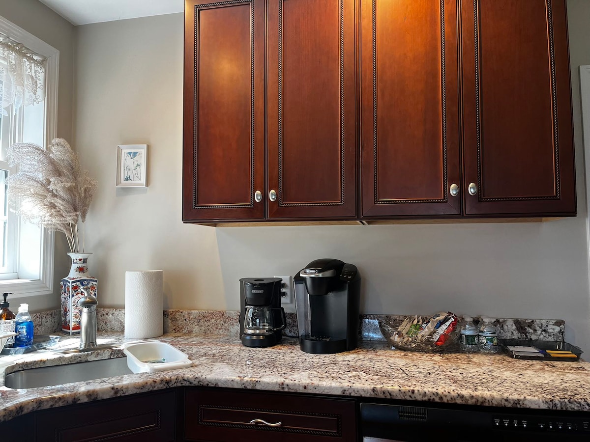 Relax in this peaceful private en suite with breathtaking backyard views of the tall pine forest. Lots of natural light fills the space with room darkening shades to sleep in. Enjoy cozy nights by the fireplace and a well stocked granite kitchen. Great location only minutes to the Mass Pike. 25 min to Boston. 30 min. to Foxboro Stadium. Enjoy shopping at the Natick Mall, AMC movies, tons of diverse dining & grocery options. Backyard has firepit for outdoor eves. Safe walkable neighborhood.