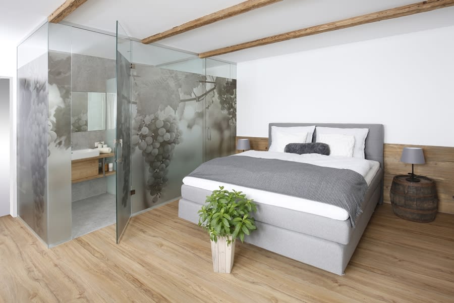 This apartment of 60 m² includes a terrace and a garden – with our favourite apple tree – for exclusive use. The small snack garden with raspberries, blackberries, snack cucumbers and cherry tomatoes (depending on the season) are yours only. This apartment on the western side of the old cider pressing house is perfect for those who want to enjoy every single ray of the sunset. Amenities in the apartment “Baumgarten”: 1 bedroom with comfortable box-spring bed, satellite TV 1 bedroom with box-spr