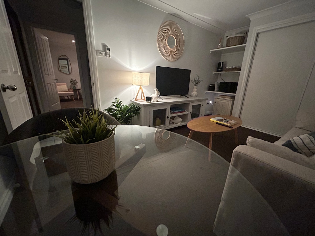 Looking for a somewhere to escape to thats filled with luxury and class? This tinyhome comes with a stunning kitchenette, a king bed to die for with pure linen sheets, a smart TV & all the comforts needed to relax and unwind. The gorgeous bathroom has everything! Underfloor heating, a round bath for you to soak in, two waterfall shower heads and robes! Relax outside on the deck or the bbq area with the fire pit with the sunset. Secured parking at your doorstep. It’s our little slice of heaven!